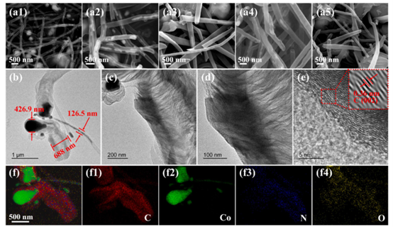 图2. (a1) NCC800-1、(a2) NCC800-2、(a3) NCC800-3、(a4) NCC800-4、(a5) NCC800-5 的 SEM 图像;(b-e) NCC800-1 的 TEM 图像;(f) NCC800-1 中 C、Co、N、O 元素的元素分布图。