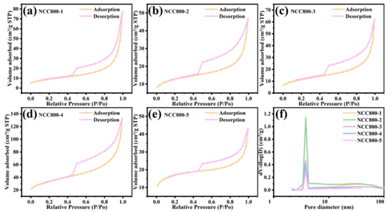 图3. NCC800复合材料氮气吸附-脱附等温线:(a) NCC800-1, (b) NCC800-2, (c) NCC800-3, (d) NCC800-4, (e) NCC800-5;(f) NCC800系列孔径分布图。