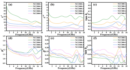 图4. NCC800的电磁参数:(a) 介电常数实部(ε'),(b) 介电常数虚部(ε"),(c) 介电损耗角正切(tan δₑ),(d) 磁导率实部(μ'),(e) 磁导率虚部(μ"),(f) 磁损耗角正切(tan δₘ)。