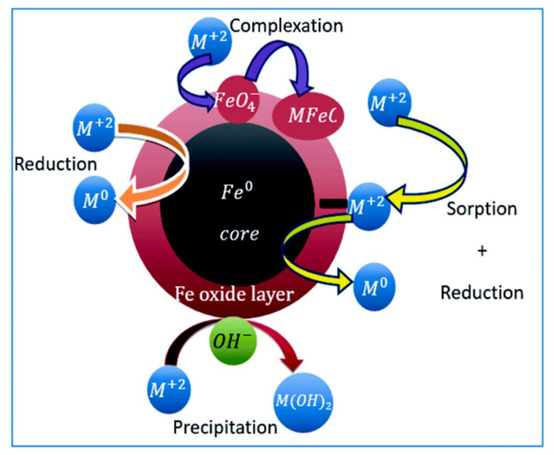 图10. 假设的使用未改性零价铁(pristine nZVI)去除水溶液中重金属(HMs)的机制。经皇家化学学会许可,转载自(Tarekegn等人,2021)。