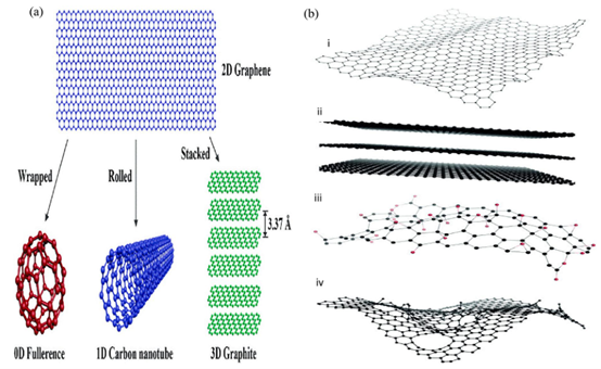 图11. a) 原始石墨烯以及通过改变其尺寸得到的产物,经许可转载自(Rout等人,2023),版权归(2022)爱思唯尔B.V.公司所有;b) 石墨烯纳米材料家族成员的化学结构:(i)石墨烯;(ii)少层石墨烯;(iii)氧化石墨烯(氧原子以红色标示);(iv)还原氧化石墨烯。经许可转载自(Bianco,2013),版权归(2013)WILEY - VCH出版社有限责任公司(德国魏因海姆)所有。