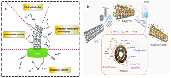 图16.3) 铅离子(Pb(II))在聚乙烯/木质素 - 碳纳米管(PE/LG - CNTs)与镍/铝氧化物(Ni/Al₂O₃)复合材料上的拟议吸附机制。经英国皇家化学会许可,转载自(C2. Wang等人,2021);b) 碳纳米管的磁性改性及其在从污染水中吸附去除锑离子(Sb(III))中的应用。经许可转载自(Z. Cheng等人,2022),版权归(2021)爱思唯尔有限公司所有。