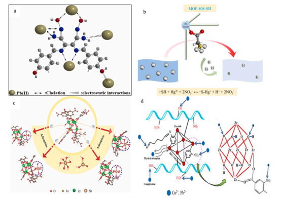 图20. a) Pb(Ⅱ)在AMO - MOF上吸附的推测机理。经(H. Wang等人,2023)许可转载,版权归(2023年)爱思唯尔有限公司所有;b) MOF - 808对Hg(Ⅱ)的选择性吸附。经(B. Sun等人,2022)许可转载,版权归(2021年)爱思唯尔B.V.公司所有;c) Fe掺 808吸附去除Sb的示意图。经(B. Sun等人,2022)许可转载,版权归(2014年)英国皇家化学会所有;d) 壳聚糖接枝MOF(CGUNCM)与水溶液中重金属(Cu(Ⅱ)和Pb(Ⅱ))的相互作用。经(Hu等人,2022)许可转载。
