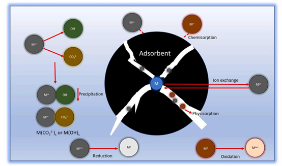 图27. 涉及去除水溶液中重金属(HMs)的协同过程,包括吸附、沉淀、还原、氧化和离子交换。