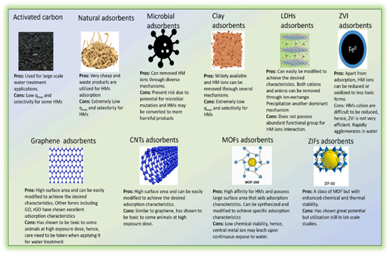 图4. 本研究中所综述的吸附剂类别及其主要优点和缺点。