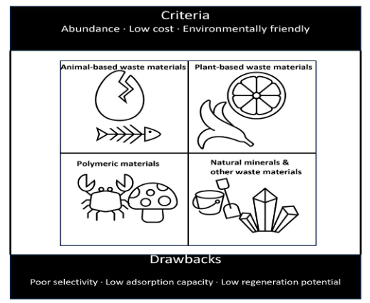 图6. 用作天然吸附剂的材料、选择标准以及其中一些材料的缺点。