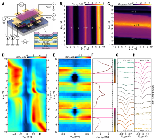 图1. 同时进行的隧穿谱与输运测量。(A)器件结构。两层魔角扭曲三层石墨烯(MATTG)通过六方氮化硼(hBN)隧穿势垒耦合,电子隧穿被限制在核心区域。(插图)器件结构的侧视图。每层MATTG被制成霍尔棒形状,用于输运测量。(B和C)顶部魔角扭曲三层石墨烯(t-MATTG)的顶部电阻Rxx,Top(B)和底部魔角扭曲三层石墨烯(b-MATTG)的底部电阻Rxx,Bottom(C)随顶部栅极电压(VTG)和底部栅极电压(VBG)的变化情况。填充因子ν已标注。在t-MATTG和b-MATTG的电子掺杂和空穴掺杂情况下均观察到超导现象。t-MATTG和b-MATTG的扭转角分别为θT ≈ 1.42°和θB ≈ 1.55°。(D)在温度T ≈ 200 mK时,隧穿电导dI/dV随层间偏压Vint和VTG的变化情况。此时b-MATTG处于正常金属相(VBG = -3 V)。观察到典型的相变级联现象。在小的Vint处出现更精细的特征。(E)零偏压附近dI/dV的放大视图。(F)用于直接比较的顶部电阻Rxx,Top。Rxx,Top为零的区域与dI/dV出现明显间隙的范围(粉色线条)相吻合。(G和H)在与(D)至(F)的y轴颜色条匹配的掺杂范围内,dI/dV的线切割图,显示出V形间隙的形成。a.u.,任意单位。