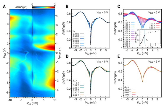 o 描述了在接近最佳掺杂(V TG = -4.55 V)的情况下,隧穿电导dI/dV随层间偏压V int的变化,且温度范围直至2.2 K。这为后续分析超导间隙在不同温度下的行为提供了基础数据。