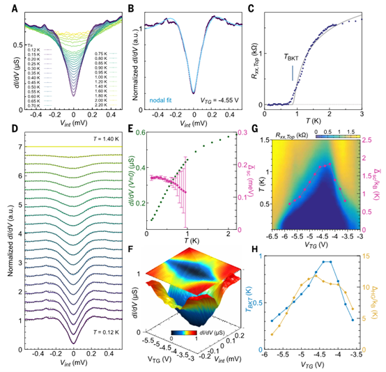 图3. 超导间隙的间隙填充行为与掺杂依赖性。(A)在接近最佳掺杂(V TG = -4.55 V)时,dI/dV随层间偏压V int的变化,温度范围直至T = 2.2 K。(B)在T = 120 mK时归一化的dI/dV(归一化至1.4 K)。浅蓝色线展示了采用具有节点序参量和间隙分布的修正Dynes公式拟合的结果,得出超导间隙的平均值Δ SC = 0.159 meV。(C)R xx,Top随温度T的变化揭示了 Berezinskii - Kosterlitz - Thouless(BKT)转变温度T BKT ≈ 0.86 K(31)。(D)归一化的dI/dV随温度T直至1.4 K的变化。虚线表示修正的Dynes拟合。(E)dI/dV(V int = 0)随温度T的变化显示出在远低于超导临界温度T c时就开始呈现线性填充行为。相比之下,Δ SC在温度T升高时最初保持不变,在更高温度时减小。这些行为让人联想到节点型超导间隙。误差棒表示95%置信区间。(F)dI/dV随层间偏压V int和顶部栅极电压V TG的三维图揭示了超导穹顶区域隧穿谱的变化。(顶部)数据的二维彩色图。(G)Δ SC的掺杂依赖性(叠加在R xx,Top随温度T和顶部栅极电压V TG的变化上)紧密跟随超导穹顶的形状。(H)T BKT和∆ HG随顶部栅极电压V TG的变化显示出相似的掺杂依赖性。