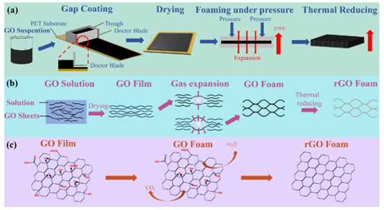 3.(c) GO表面官能团转化示意图**:此部分揭示了材料在**化学层面**的核心变化。它说明了氧化石墨烯片层表面丰富的含氧官能团(如羟基、羧基、环氧基)在**加热发泡和高温处理**过程中,如何通过分解、释放气体(驱动发泡)并被移除,从而使材料从绝缘或弱导电的氧化石墨烯,转变为导电性和导热性显著增强的还原氧化石墨烯。这是实现材料良好热学性能的关键化学过程。