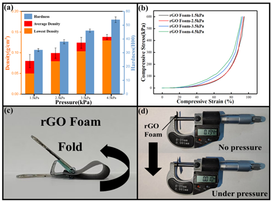 (a) 不同压力下制备的rGO泡沫的肖氏硬度与密度;