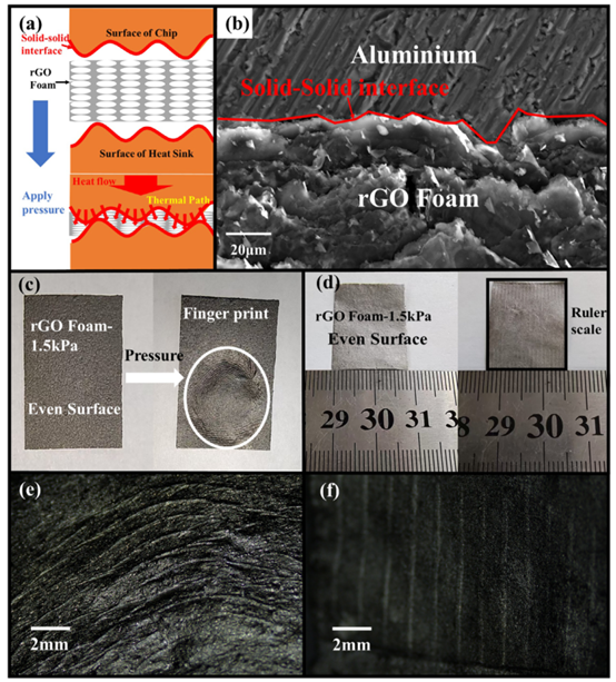 随着电子产品日益小型化及功率密度不断提升,高效散热变得至关重要。热界面材料(TIMs)对于确保下一代器件的可靠性与可持续运行至关重要。传统研究通常将高导热率作为首要目标。然而,TIMs的厚度、压缩性和可变形性同样对传热性能产生关键影响。本文报道了一种新颖的策略,通过调控发泡过程中的压力来控制孔结构,从而制备出具有高压缩性和低热阻的超轻三维多孔石墨烯TIM。所制备的还原氧化石墨烯(rGO)泡沫兼具超高压缩性(94.85%)、低密度、低热阻(在100 psi下为0.151 cm²·K/W)以及优异的面内温度均匀性,同时对复杂配合界面展现出卓越的贴合性。在20–30 W的散热功率下,相较于商用导热垫(5 W/m·K),芯片温度实现了显著降低(8.83–13.3°C)。此外,这些TIMs的可制造性为面向下一代高功率密度电子器件的TIM制备展示了一种有前景的新途径。