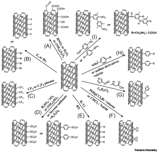 B & C. 卤化(特别是氟化):通过引入卤素原子(尤其是氟),显著改变CNT的表面能,使其从疏水性变为疏油性或高反应活性。氟化CNT可作为中间体,其C-F键易于被其他亲核基团取代,从而实现多种官能团的接枝。