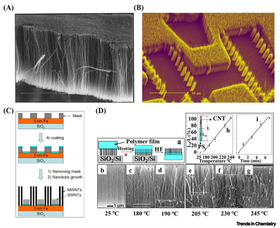 B(光刻图案化):展示了将光刻这一成熟的微电子加工技术应用于CNT阵列,实现微米级空间图案控制。这标志着CNT研究从材料制备迈向器件集成,为制造传感器、电极阵列等微型器件铺平了道路。