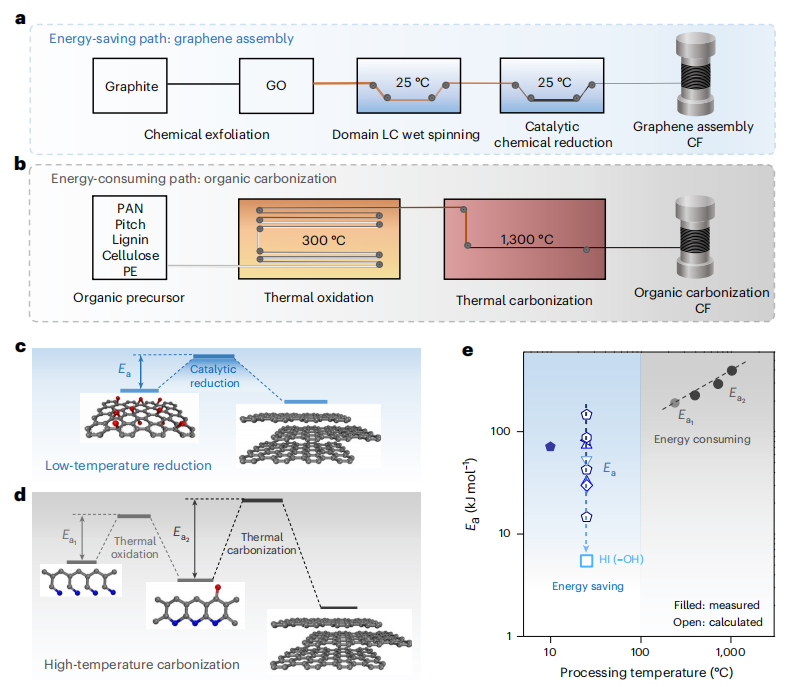 图1 | 通往碳纤维(CFs)的两条路径对比。a,在室温下制备石墨烯纤维(GF)的节能路径示意图,该路径步骤简单,涉及天然石墨的化学剥离、域液晶湿法纺丝以及催化化学还原。b,在1300°C高温下制备传统碳纤维的示意图,该路径步骤耗能高,涉及热氧化和热碳化。c,室温下氧化石墨烯(GO)的还原示意图(c)。d,有机聚丙烯腈(PAN)的高温碳化示意图。e,不同试剂对氧化石墨烯进行化学还原以及聚丙烯腈碳化时,活化能(Ea)与处理温度的关系图。