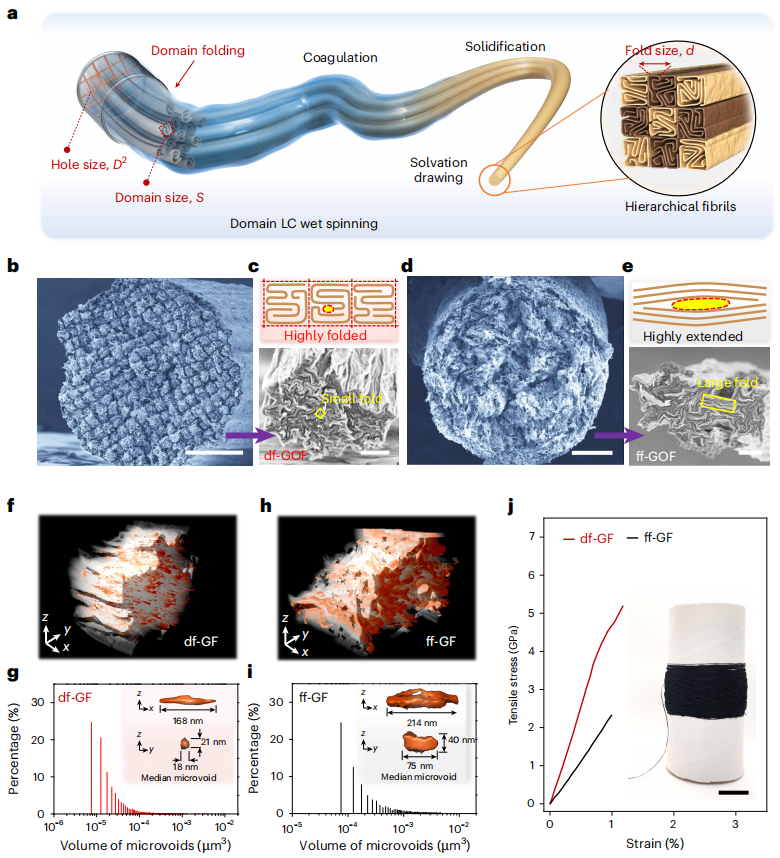 图2 | df-GF的制备。a,区域液晶(domain LC)湿法纺丝方法示意图,通过连续的区域折叠、凝固、固化和溶剂化拉伸步骤,制备出由数百根相互融合的原纤维组成的具有层次结构的石墨烯氧化物纤维(GOF)。
