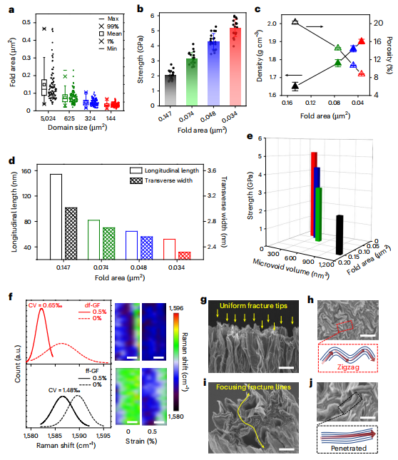 a, 组装石墨烯折叠面积与石墨烯纤维领域尺寸的关系。a中的数据为独立技术重复实验的平均值±标准差(n>93)。b, 不同折叠面积制备的石墨烯纤维的拉伸强度。b中的数据为独立技术重复实验的平均值±标准差(n=20)。c,d, 组装石墨烯的密度和孔隙率与折叠面积的关系(c)以及微孔尺寸与折叠面积的关系(d)。e, 石墨烯纤维的平均拉伸强度与微孔体积和组装石墨烯折叠面积的关系。请注意,小角X射线散射(SAXS)可以收集到聚焦离子束-扫描电子显微镜(FIB-SEM)断层扫描无法观察到的超小微孔,从而统计得到更小的平均微孔尺寸。f, 从5×10μm²的映射(右)中收集到的在0.5%应变下域折叠石墨烯纤维(df-GF)和自由折叠石墨烯纤维(ff-GF)的拉曼位移分布(左)。比例尺,2μm。g–j, df-GF(g和h)和ff-GF(i和j)断裂表面的扫描电子显微镜(SEM)图像。比例尺,1μm(g和i);500nm(h和j)。不同的断裂行为在虚线框中展示。上述df-GF采用最精细的领域尺寸(144μm²)制备。