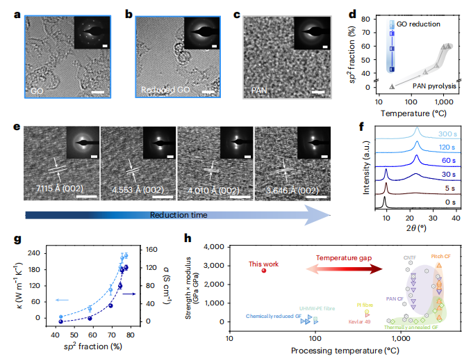 图4 | 石墨烯纤维(GF)的结构演变与性能关系。a-c,单层氧化石墨烯(GO)片(a)、单层还原GO片(b)和原始聚丙烯腈(PAN)(c)的原子结构透射电子显微镜(TEM)图像。比例尺,2纳米。插图展示了相应的选区电子衍射(SAED)图谱。比例尺,3纳米-1。d,通过X射线光电子能谱追踪的两种路径下纤维的sp2杂化碳比例。e,f,从氧化石墨烯纤维(GOF)到石墨烯纤维(GF)的结构演变,通过TEM(e)和X射线衍射(XRD)(f)进行追踪。比例尺,5纳米(e)。插图展示了相应的SAED图谱。比例尺,3纳米-1。g,结构演变与热导率和电导率的关系。数据表示为独立技术重复的平均值±一个标准偏差(n=3)。h,强度×模量与加工温度的Ashby图表,说明了一个普遍规律,即通过增加输入能量可以实现纤维材料更高的机械性能。我们的纤维打破了这一关键规律,在室温下实现了高强度和高模量。