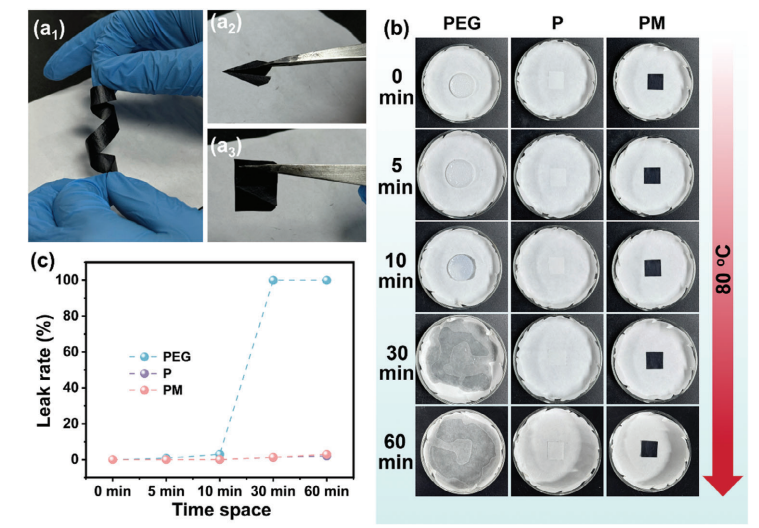 图3. a1) 扭曲后的PM复合薄膜照片,a2) 呈飞机形状的PM薄膜照片,以及a3) 恢复原状的PM薄膜照片。b) 形状稳定性实验的数码照片。c) 在80°C下,P薄膜、PM复合薄膜和纯PEG在不同时间段的泄漏率。