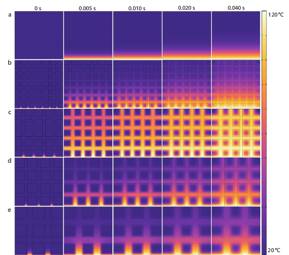 图5. 纯PDMS (a) 以及含有不同孔径(0.11 mm (b)、0.24 mm (c)、0.30 mm (d) 和 0.41 mm (e))GO@f-CNTs导热网络的GO@f-CNTs/PDMS复合材料的有限元分析。