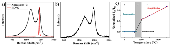 a) 典型石墨结构(高度有序热解石墨,HOPG)和典型生物质衍生无定形碳(经退火处理的水热碳,annealed HTC)的拉曼光谱。