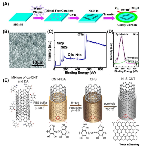 图4. 掺杂碳纳米管(CNTs)的合成策略及电子显微图像。(A)氮掺杂碳纳米管(N-CNTs)合成示意图。(B)在水等离子体处理的SiO₂/Si基底上生长的N-CNTs的扫描电子显微镜(SEM)图像。(C)N-CNTs的X射线光电子能谱(XPS)全谱扫描。(D)N-CNTs的N 1s精细谱。(A-D)经许可转载自[76]。版权所有©2010美国化学会。(E)采用两步法“接枝-热解”策略制备N, S共掺杂CNTs的示意图。(E)经许可转载自[15]。版权所有©2017 Wiley-VCH。缩写:CVD,化学气相沉积;DA,多巴胺;PDA,聚多巴胺。