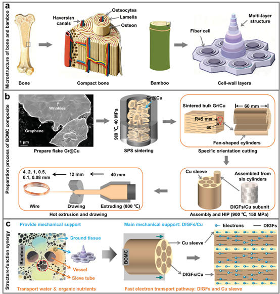 图1. (a) 骨骼和竹子的微观结构 (b) BOMC线材制备过程示意图 (c) 竹子与BOMC的结构-功能协同示意图