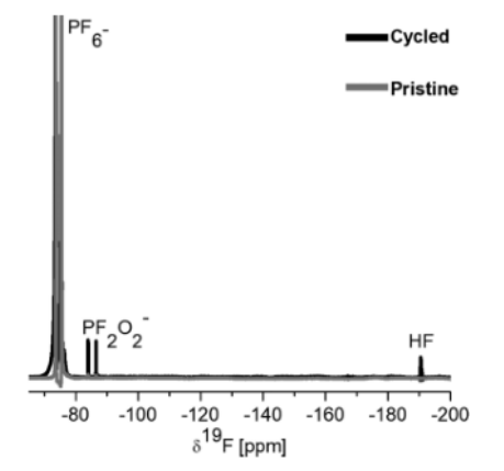 H NMR,在 C/10 在 3.0 和 4.6 V(黑色)之间进行 10 次恒电流循环后,与原始电解质(灰色)的 NMR 谱重叠。