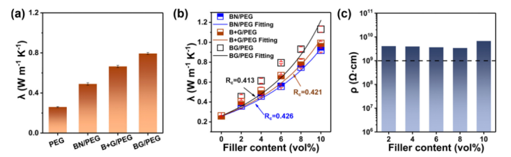 图4. (a) 相同BN添加量的PEG及其复合材料的导热性能。(b) BN/PEG、B+G/PEG和BG/PEG复合材料导热系数的改进Hashin-Shrikman模型拟合。(c) BG/PEG复合材料的体积电阻率。