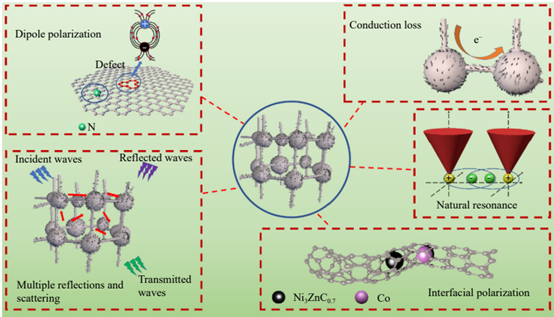 磁损耗:Ni₃ZnC₀.₇/Co纳米颗粒提供自然共振与涡流损耗。