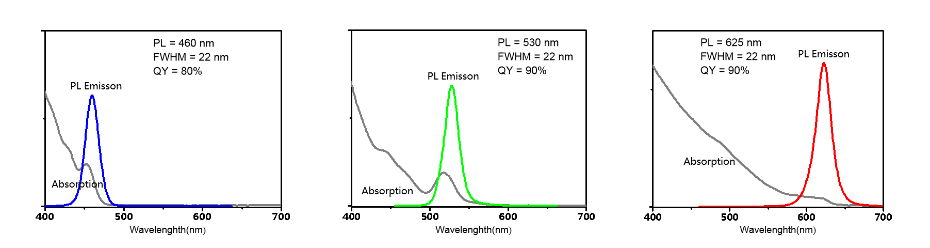 CdSe/ZnS QDs经由特殊专利工艺精制而成,具有发射光谱半峰宽小、 发光效率高、镉含量低、性能稳定等优点,应用范围广泛。